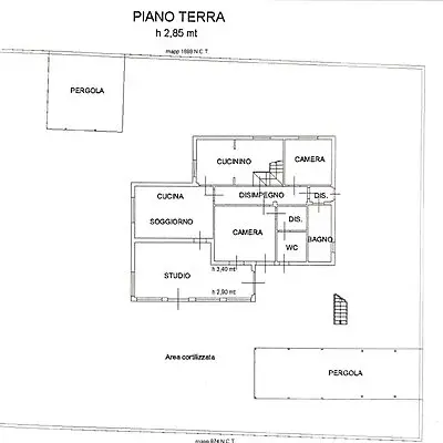 The villa, occupying a plot of approximately 900 square meters, is structured across two levels and was constructed in two stages: the ground floor, authorized by a building permit issued in 1978, and the upper floor extension, permitted in 2013. The ground floor entrance welcomes with an abundance of natural light streaming through large arched French windows, leading to the adjoining rooms which include an extra living room, a kitchen, two bedrooms, and two bathrooms. The upper-level houses two additional bedrooms, a living room, a bathroom, and a generous veranda accessible via an external staircase, ensuring versatile use of space. The residence is equipped with a photovoltaic system and a split air-conditioning unit for efficient room heating and cooling.